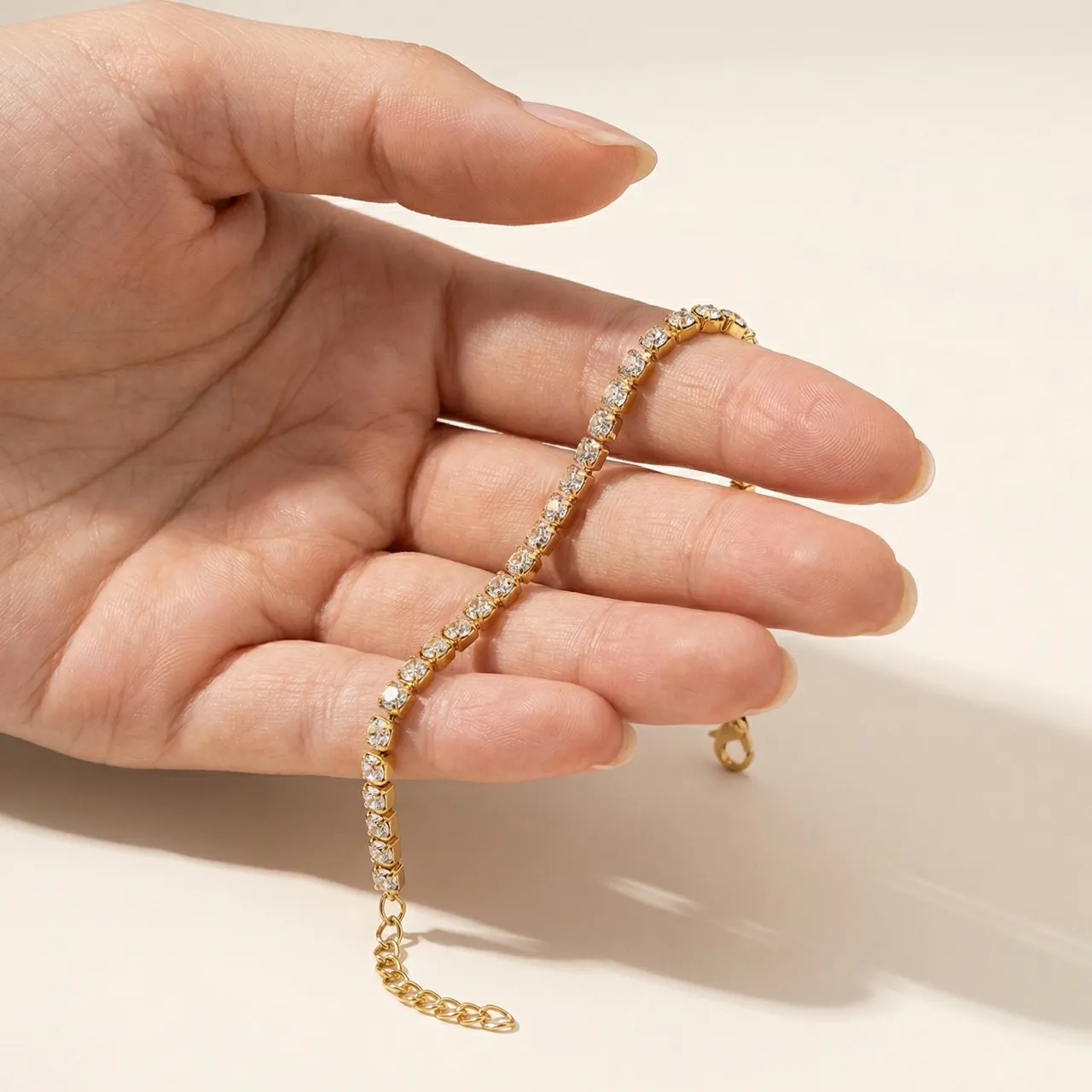 Chaque pierre, soigneusement alignée, crée un flux lumineux continu qui épouse délicatement le poignet. Sa structure façon gourmette lui apporte caractère et présence, tout en conservant la finesse et la brillance emblématique du bracelet rivière.